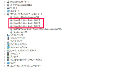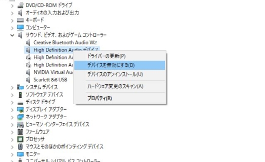 サウンド、ビデオ、およびゲームコントローラーの項目を展開して、不要なデバイスを全て無効化する