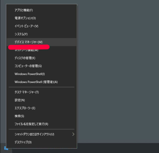 画面左下にあるWindowsマークを右クリックしてデバイスマネージャーを選択
